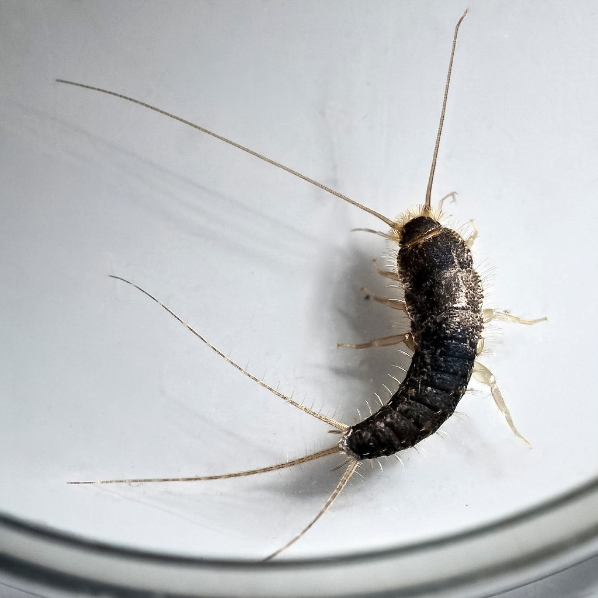 - Små, sølvglinsende insekter langs gulvlister og i hjørner.